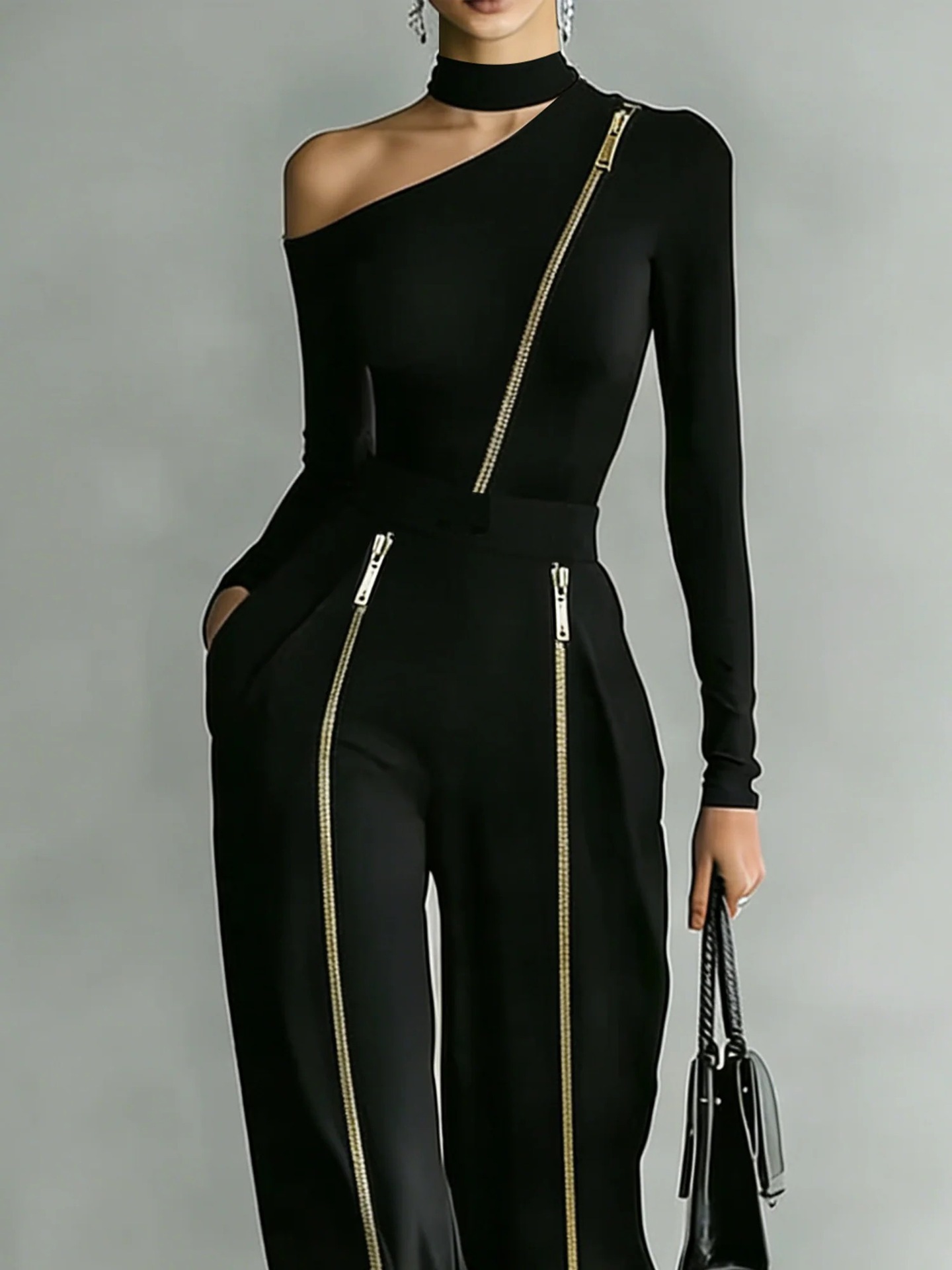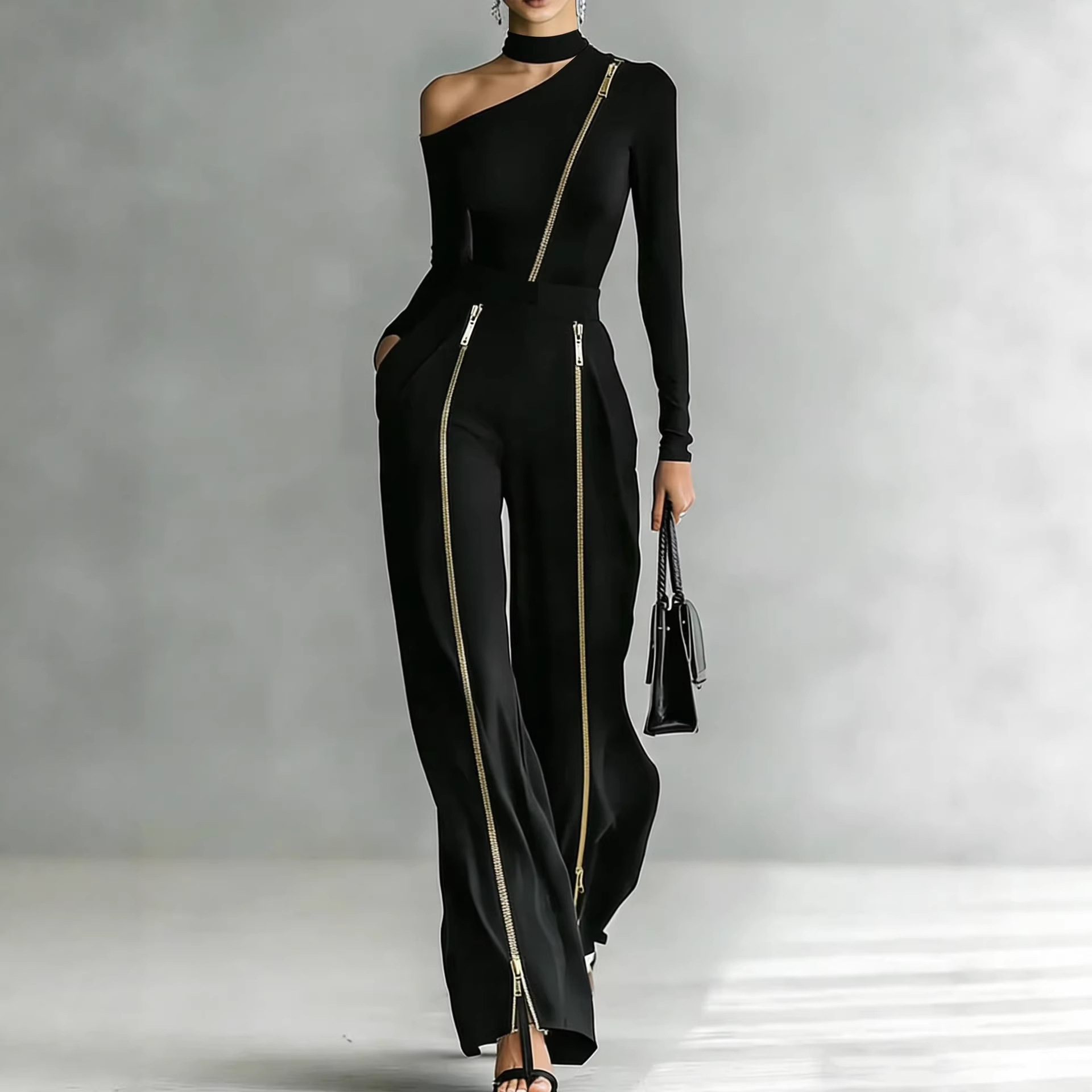 Crew-neck Long-sleeve Knit Two-way-zipper Wide-leg Pants Set